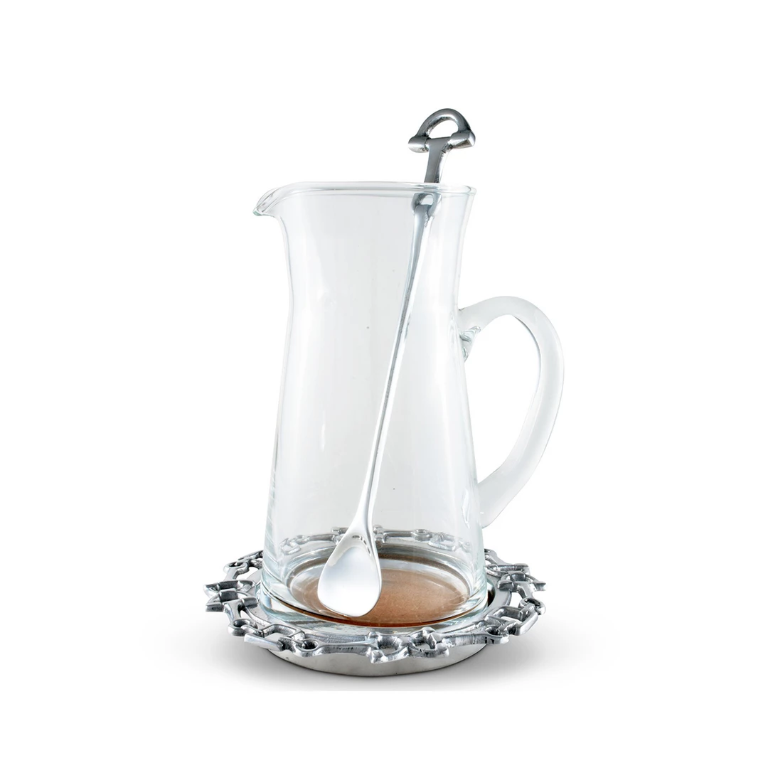 Interlocking bits encircle the pitcher’s handmade, aluminum base, which also comes with a removable cork. Another half-piece bit attaches to the ladle’s long handle, forming a sturdy grip above the glass for stirring. Create favorite drink mixes for parties or evening cocktails in this Arthur Court equestrian pitcher set. Horse lovers will admire the decorative base adorned with interlocking horse bits that comfortably and safely hold the glass pitcher in place when mixing. The included ladle features a half-piece horse bit at the end that provides a sturdy grip so it won’t slip from fingers when stirring. The ladle is long enough to reach the bottom of the pitcher so ingredients are fully mixed.