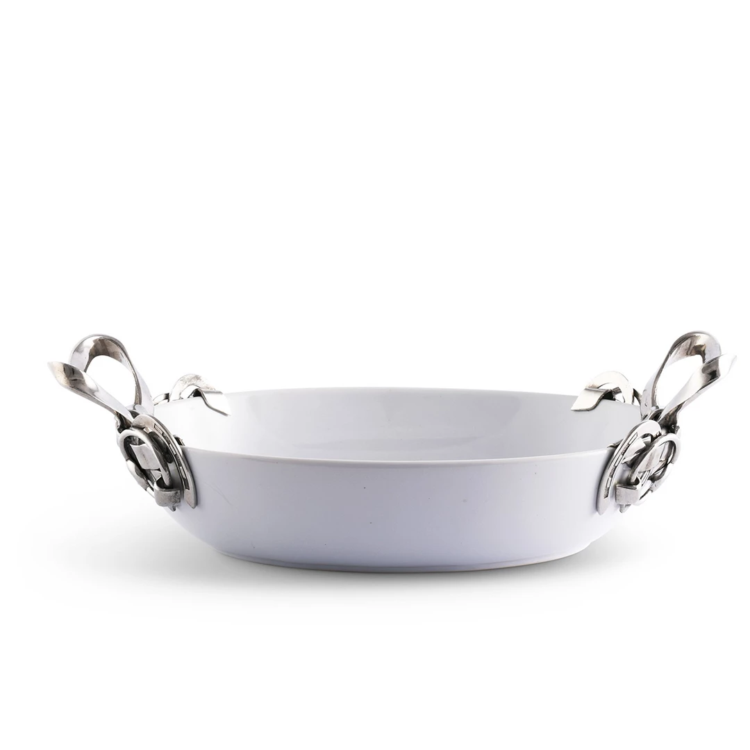 Complement your Equestrian Collection with this attractive Small Horseshoe and Bit Tray. Crafted in luxury-grade pewter, snaffle bits, horseshoes and cinches combine to create innovative handles on this oval piece. These gorgeous designs offer the perfect accent to our elegant stoneware.