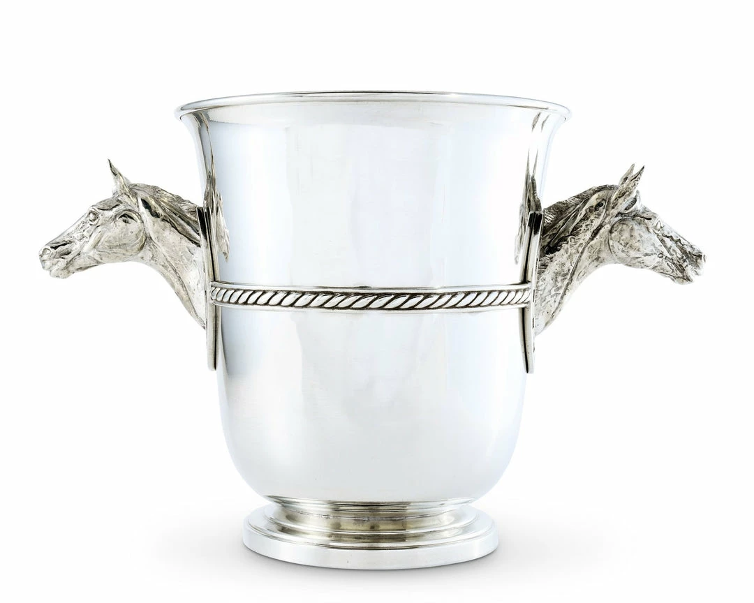 Exquisite horse heads function as handles on this pure-pewter champagne bucket. These realistically detailed thoroughbreds display within horseshoes on either side of this piece. Bands of figural rope wrap around the center of the bucket before connecting to the sides of each horseshoe.