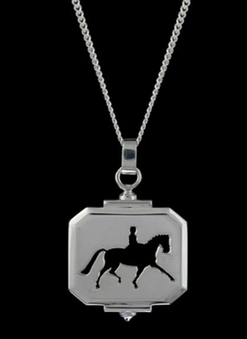 Equestrian Dressage Extended Trot Necklace featuring rider and horse. The horse is captured in a perfect extended trot. The horse and rider take on whichever color blouse or shirt you’re wearing!