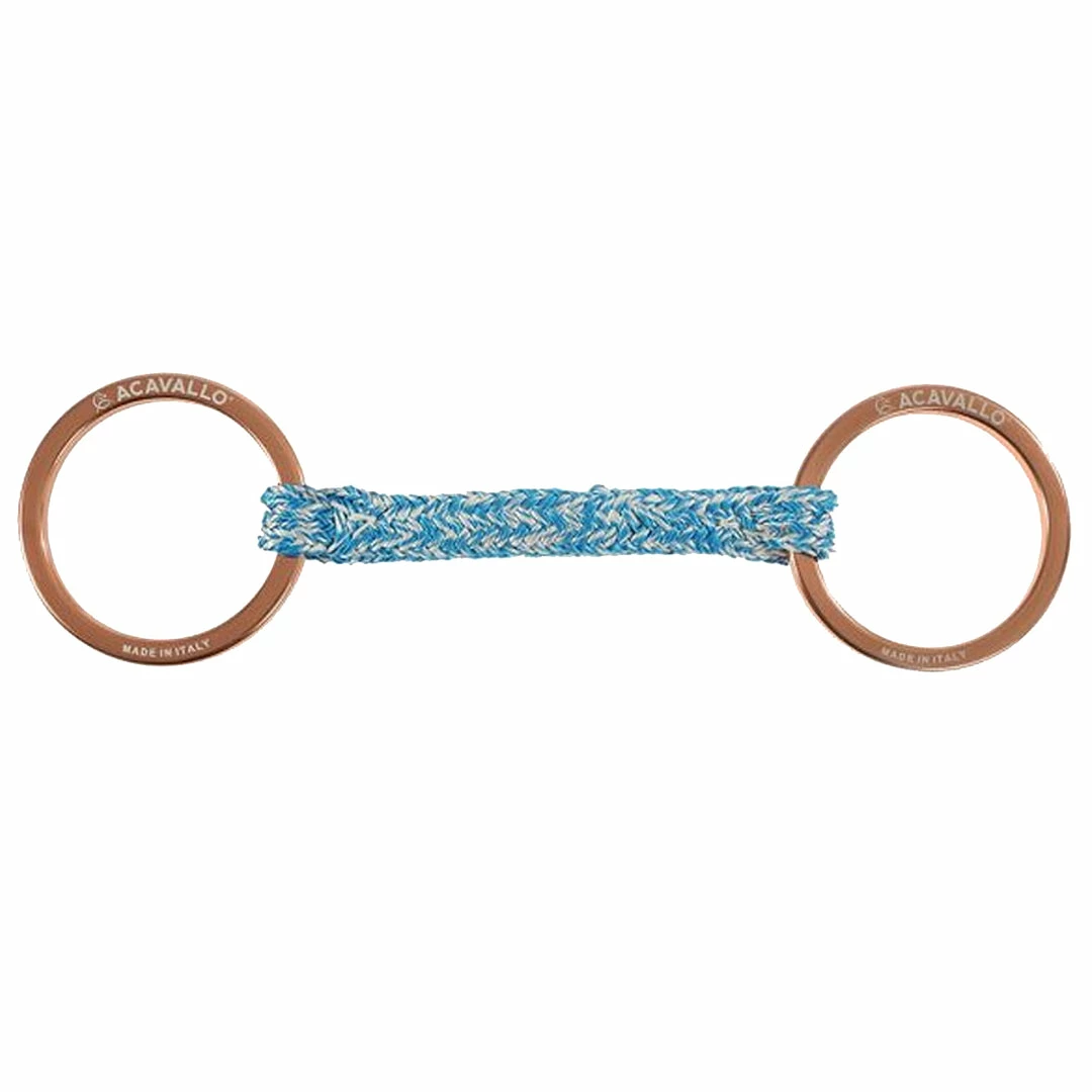 The Acavallo “Jumpe” AluPro Bit is made of a certified 100% anti-fray twisted fiber called “Jumpe” and fitted with two anodized aluminum rings available in various gloss colors and have a thickness of 7mm. The weight of this new bit amounts to approx. 65g. The outer diameter of its rings is 80mm, a measure that proved to be highly comfortable for the horse in this configuration.