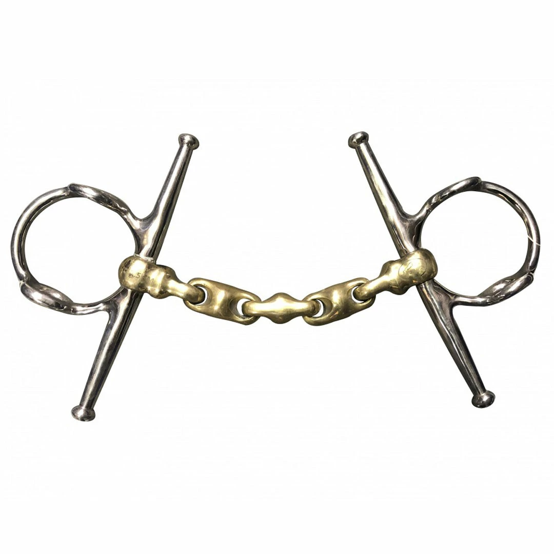 Featuring 50mm rings, a 17 mm mouthpiece, and composed of a German Silver Alloy, this bit is unique in the fact that breaks up the pressure points on the horse. Helps keep horses light in the mouth. The gag cheekpieces offer more leverage for heavier horses.