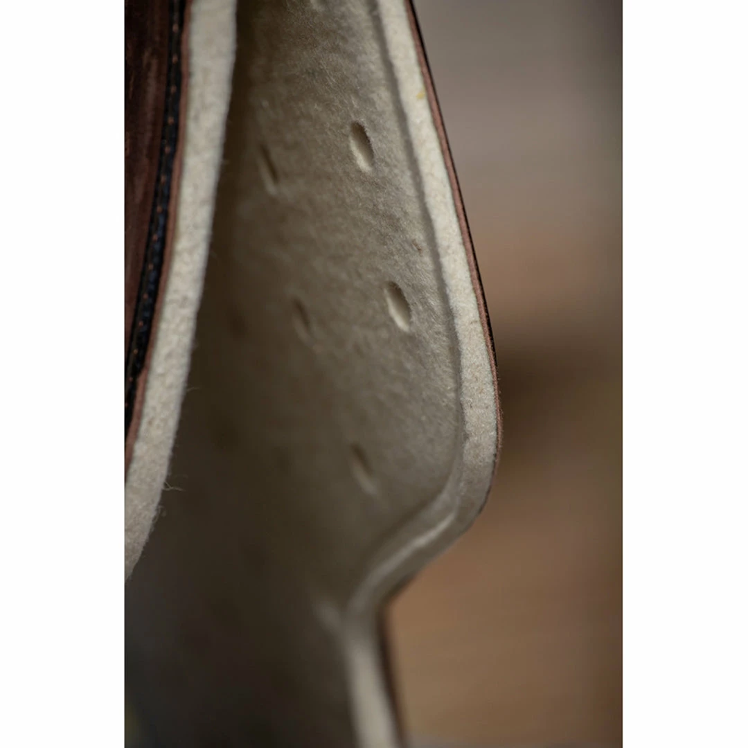 This half pad is made of three high quality fabrics : felt, shock absorbing neoprene and rough leather. The color on the outside is Havana and it comes with a black and caramel saddle stitch piping. An airy 3D mesh band on the top helps to lighten the line of the horse’s back and make it more breathable. This band allows the withers to move free and provides optimal comfort to the horse.