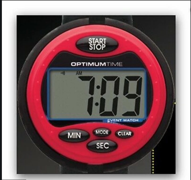“THE ULTIMATE EVENT WATCH” IS A WATERPROOF TIMER WITH A JUMBO DISPLAY AND FEATURES A CLOCK, A COUNT UP FROM ZERO, A COUNTDOWN FROM A PRESET, WITH AN ALARM. THE BUTTONS HAVE A POSITIVE CLICK-TYPE OPERATION ON THE TOP PANEL THAT PREVENTS ACCIDENTAL ACTIVATION. THE STANDARD IN THE EVENT FIELD WORLDWIDE. Available in a variety of colors.