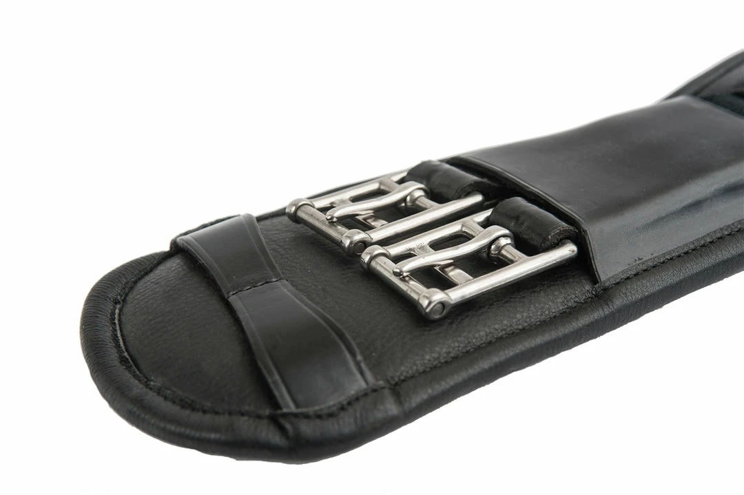 Designed by dressage riders with dressage riders in mind-this girth is sweet! The Passage dressage girth is exceptionally comfortable as well as attractive and durable. It is beautifully padded with luxurious leather in a contour design and with rolled edges to alleviate rubs. The elastic as both ends allows for even distribution of pressure. Stainless steel roller buckles and padding behind the buckles is extended to help shield the horse from billet rubs.
