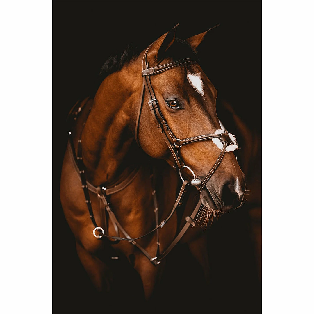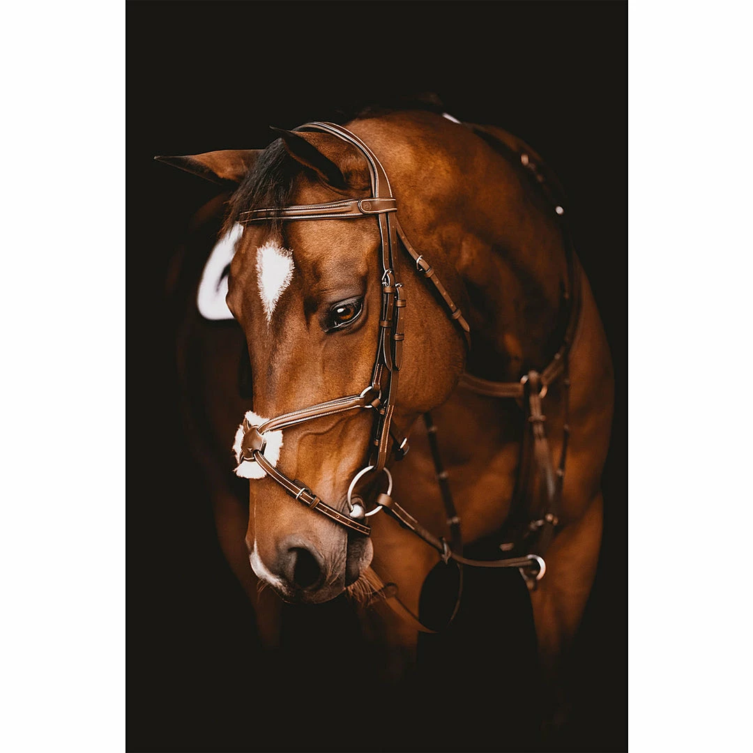 We love this bridle for its fine leather and the soft sheepskin padded center button, giving your horse ultimate comfort.