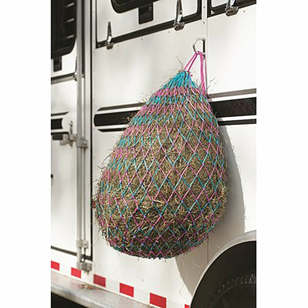 Extra strong hay net featuring a large metal ring at the bottom and small metal rings around the for easy filling, tying and hanging. Mesh features approximately 2″ holes to reduce waste and slow feeding.