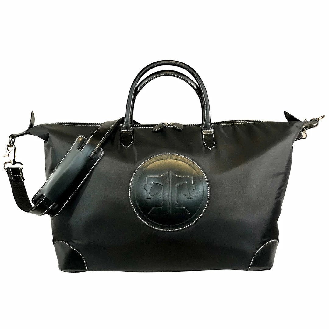 This generous overnight duffle bag is designed with padded heavy/duty 900d black nylon featuring full grain smooth leather accents in tones of chestnut or black. Comfort continues with supple rolled leather handles and an optional, adjustable padded shoulder strap. Refined interior with private zip and open pocket. Finished with silver feet and hardware.
