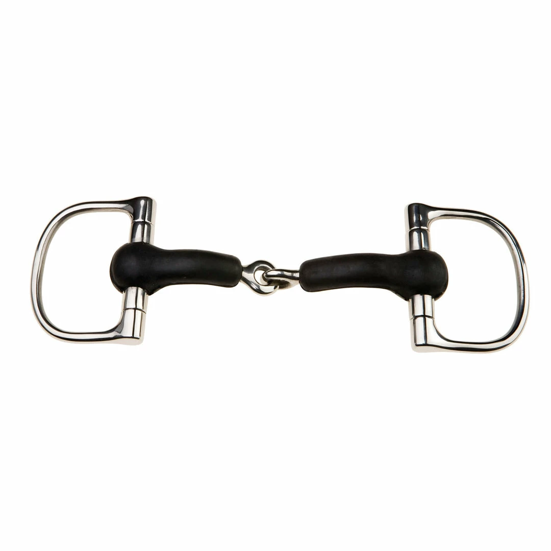 We love the JP Korsteel Rubber Mouth Jointed Dee Ring Snaffle Bit because unlike a standard jointed snaffle’s nearly straight mouthpiece, JP bits have a curved shape that eliminates the interference that conventional bits can cause.